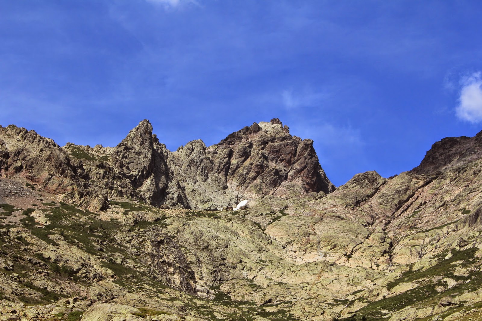 En quatre hores arribo a la Pointe des Eboulis pensant que estic arribant al cim del Mt. Cintu. Un cop allà, veig la vessant nord i la Vall d'Asco, i a un centenar de metres més endavant, el Cim del Mt. Cintu. Haig de baixar una mitja hora per una zona complicada de blocs de pedra drets com grans menirs. En algun punt em trobo bagues abandonades d'excursionistes prudents que han rapelat trams curts. Vaig cercant el millor lloc per anar avançant, vaig lent i desanimat, quina cagada, mirava amunt i no sabia quina era la traça a seguir, des de sota només es veuen parets de pedra! El color de la roca és molt curiós, hi ha parts de roca verda i parets enormes de roca trencadissa de tonalitats violetes.